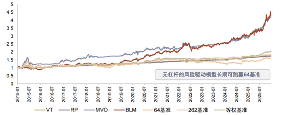 ► 无杠杆设置:为了横向比较各模型收益表现,我们并未对风险驱动模型设置杠杆,因此超配低风险资产更偏向防御,收益表现较弱。