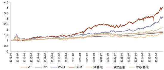 我们从2015年-2025年、月度换仓的量化实测效果来比较各个模型在中国资产和全球资产配置上的有效性。由于部分模型依赖的假设与超参数较多,我们选择了相对主观超参数较少、能量化回测的收益驱动和风险驱动模型进行测试,包括共9个策略:均值方差、约束优化、Black-Litterman、LSTM结合Black-Litterman、动量-波动率协同、风险平价、风险预算、波动率目标、CVaR优化。