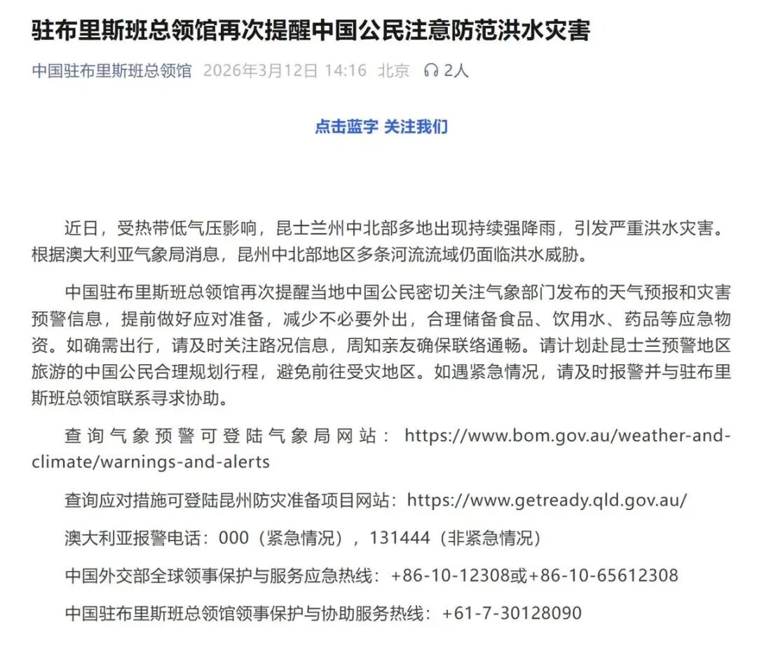 中国驻布里斯班总领馆3月12日发布教导称,字据澳大利亚征象局讯息,昆士兰州中北部地区多条河流流域仍濒临急流阻扰。总领馆再次教导当地中国公民密切关爱征象部门发布的天气预告和灾害预警信息,提前作念好玩忽准备,减少不消要出门。如确需出行,请实时关爱路况信息,周知亲一又确保聚积通顺。请认识赴昆士兰预警地区旅游的中国公民合理决策行程,幸免赶赴受灾区区。