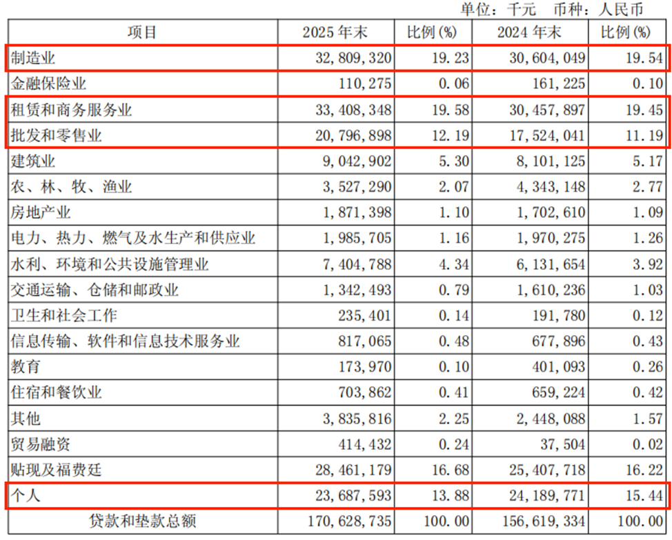而与之相对应的是,2025年无锡银行加大了安全性更高的对公贷款投放,同比大幅增长12.8%,达到了1220.36亿元,占比提高至71.52%,对公不竭证据“压舱石”作用。字据财报,这些对公贷款主要投向了制造业、租出和商务干事业、批发和零卖业,占总贷款的比重分手为19.23%、19.58%和12.19%。
