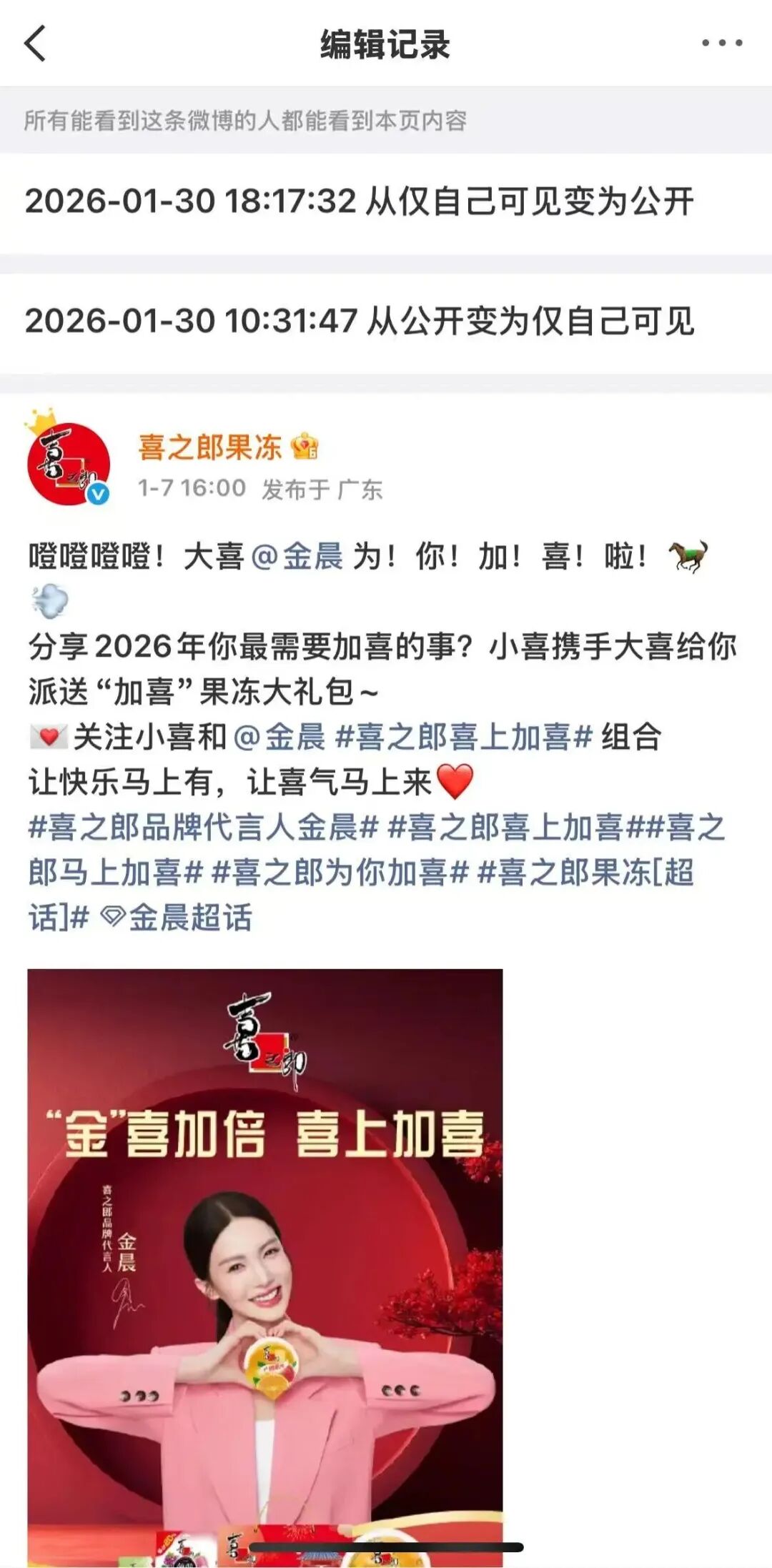 佳成网配资30日下午6时19分许,记者注意到,喜之郎已将金晨代言的相关微博再次放出。微博编辑记录显示,30日上午10时31分从公开变为仅自己可见,30日18时17分由仅自己可见变为公开并做了置顶。