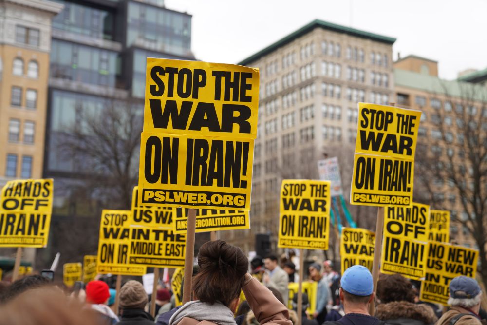 3月7日,东说念主们在好意思国纽约参加蚁集游行,抗议好意思国和以色列对伊朗发动军事打击。新华社记者张凤国摄