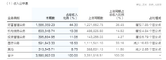 国外业务收入59.18亿元,同比下跌46.75%,占总收入比重从33.16%腰斩至16.53%。公司在解说中将其归因于“昨年贬责子公司一次性损益举高可比基数”。剔除贬责AssetMark的一次性影响后,施行增长23.82%。