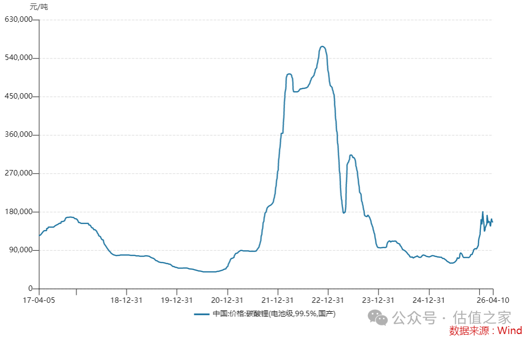 图片评释:碳酸锂价钱变化,数据来源于Wind