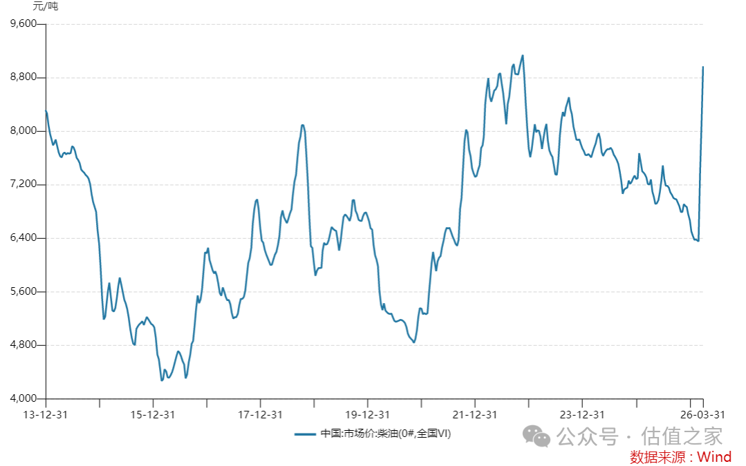 图片评释:中东乱局后柴油价钱快速飙涨,数据来源于Wind