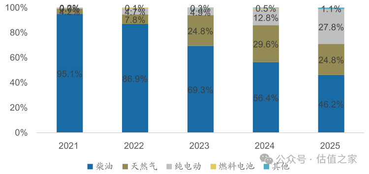 2024年起,跟着以旧换新补贴落地重叠碳酸锂价钱下行带动电板老本下落,新动力重卡浸透率快速提高,2024年全年新动力渗重卡销量7.8万辆,同比增长154.1%,新动力浸透率达12.8%,2025年势头延续,全年新动力销量达23.1万辆,新动力浸透率激增至27.8%。